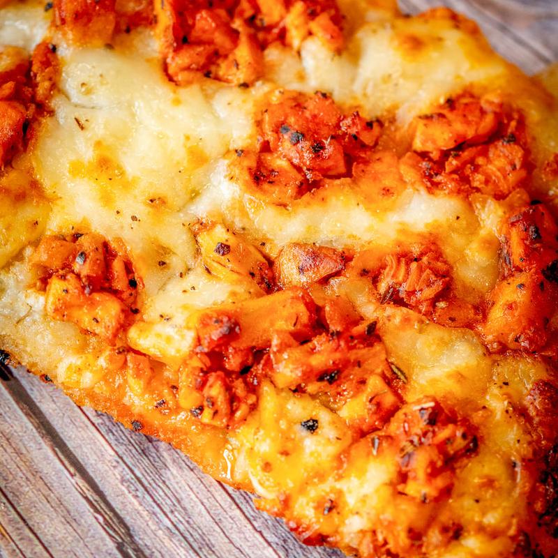 Barbeque chicken base with shredded mozzarella, sauce, and honey mustard.
